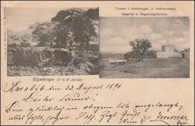 Zweibildansichtskarte „Otjimbingue / Tränke i. Haikamgab b. Swakopmund“ aus dem Verlag L. Rascher & Co. Hamburg mit dem Text: „Karabib am 23. August 1896 – Lieber Freund! Bin glücklich in obigem Orte angelangt, alles fehlt, sogar Soff.* Herzl. Gruß Dein H. Zwirner Gefr.“