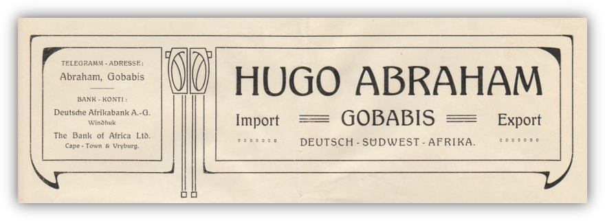Bereits 1897 wanderte Hugo Abraham (31.10.1871-14.7.1921) im Alter von 26 Jahren nach Deutsch-Südwestafrika aus und siedelte sich später in Gobabis an. Er betrieb dort eine Farm mit Viehhandel und nebenbei ein Warenhaus mit einem Verlag, indem u.a. auch Ansichtskarten hergestellt wurden. Bisher sind nur wenige davon bekannt.