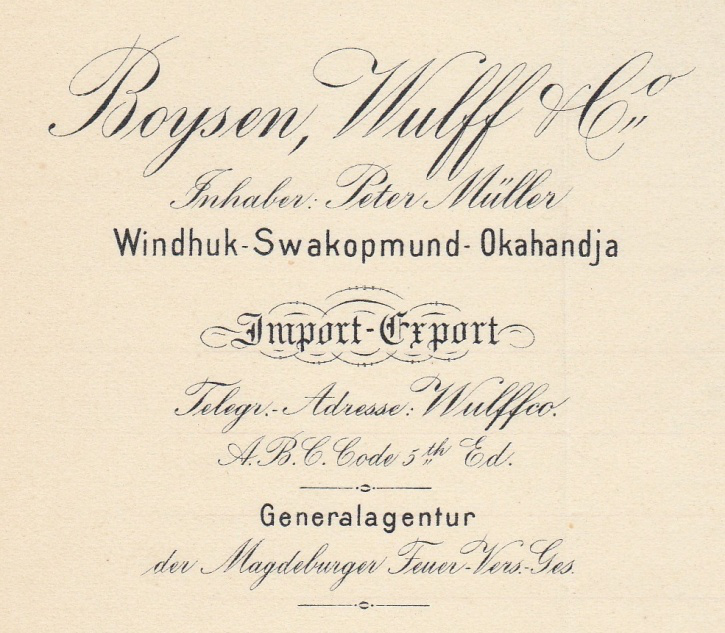 Im Laufe des Jahres 1893 wanderte Dietrich Boysen (? – 4.7.1909) mit Frau und zwei Kindern nach DSWA aus und eröffnete in Windhuk eines der ersten Kaufhäuser. Im Dezember 1896 trat der Kaufmann Carl Wulff bei Boysen ein. Die Kriegsereignisse und der Tod seines Bruders Herr Raimund Boysen (24.03.1876 -13.01.1904), der bei einem Kampf gegen die Hereros 1904 gefallen war, erzwangen Änderungen im Geschäfts- und Privatleben der Einwohner. Die Geschäfte Dietrich Boysen und Carl Wulff & Co. wurden zusammengelegt und firmierten nun unter Boysen, Wulff & Co. Der bisherige Prokurist Peter Müller wurde als Teilhaber aufgenommen und übernehm später nach dem Tod von Herrn Dietrich Boysen den Betrieb.