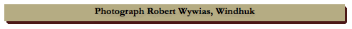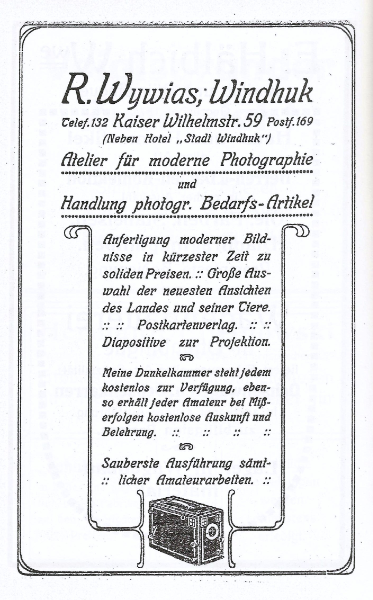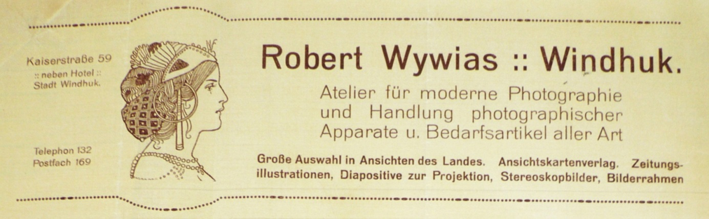 Am 26. März 1896 landete Robert Wywias mit dem Woermann Dampfer „Gertrud Woermann“ auf offener Reede vor Swakopmund in Deutsch-Südwestafrika an. Er gehörte zu einer Gruppe Auswanderer, die ihr ganzes Leben in DSWA verbrachten. Er machte sich in Windhuk als Photograph selbstständig und belieferte auch andere Photographen und Postkartenverleger. Er und seine Familie verließen DSWA als Freiwillige 1919 das Land.