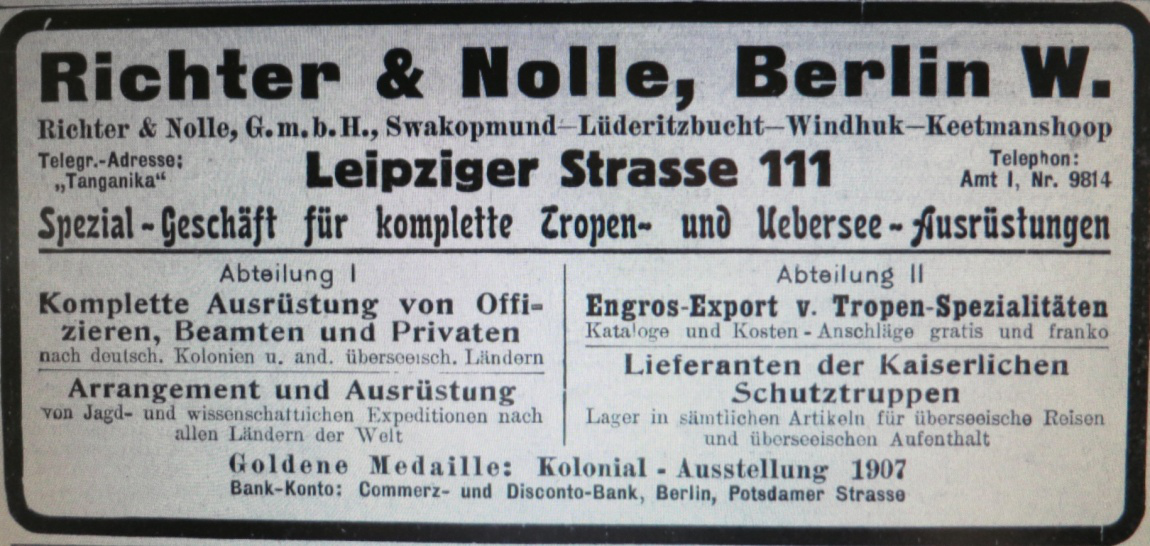 Die in Berlin alteingesessene Firma Richter & Nolle gründete 1908 erst in Swakopmund eine Niederlassung, später dann auch in Lüderitzbucht, Windhuk und Keetmanshoop; Geschäftsführer in DSWA war Ernst Nolle. Es wurden komplette Ausrüstungen für die Tropen und Kolonien angeboten. Neben Zeitschriften und Büchern wurde auch eine Ansichtskartenserie aufgelegt
