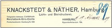 Knackstädt & Näther dürfte zu den wirklich grossen Marktführern des Ansichtskartenbooms um 1900 gehört haben. Die Firma Knackstedt & Näther, Kunstanstalt für Lichtdruck und Photographie wurde von Wilhelm Georg Ludwig Knackstedt und Hermann Gustav Näther 1889 gegründet. Obwohl Näther das Unternehmen schon 1893 wieder verließ, blieb der Name noch längere Zeit bestehen. Die Geschichte des expandierenden Unternehmens ist sehr komplex und nur unvollständig bekannt. Neben der Hauptfirma, die eine Licht- und Steindruckerei, eine chromografische Anstalt und ein photographisches Atelier für Portrait- und Industrieaufnahmen betrieb, gab es noch zahlreiche dezentrale Ateliers in Hamburg und Cuxhafen; dazu kamen noch assoziierte Unternehmen in Paris, New York und Wien. 1906 produzierten in Hamburg 290 Mitarbeiter etwa 100 Millionen Postkarten, von denen 60 % exportiert wurden, ein grosser Teil davon in die USA. Das Unternehmen hat wohl bis 1967 in Hamburg bestanden.