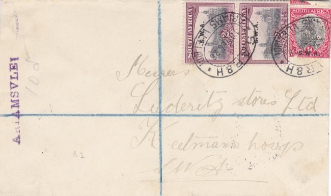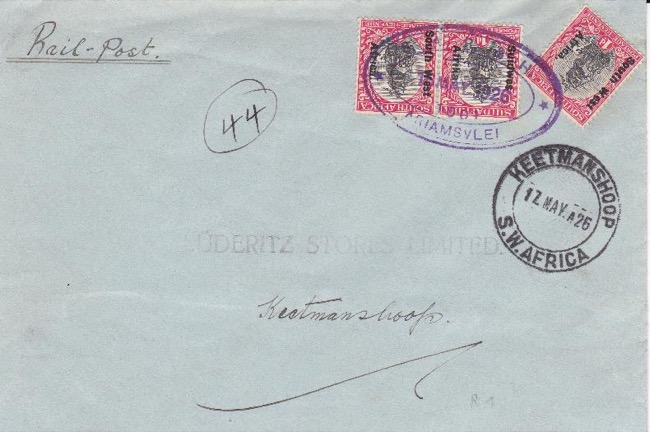 11.5.1926: Brief aus ARIAMSVLEI mit Stempel R. 1 nach Keetmanshoop, befördert auf der Nord - Südlinie [3] | |