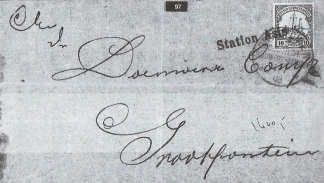 04.07.1908: Bedarfsbrief auf der Bahnstation ASIS aufgegeben und bei Ankunft in Grootfontein von der Post nachgestempelt. (ex Berker, HBA 1995) | |