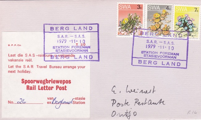 10.11.1979: Brief aus Bergland mit Stempel R. 1 nach Outjo, befördert auf der Nord – Südlinie bis Kranzberg, dann auf der Nordlinie bis Outjo [1] | |