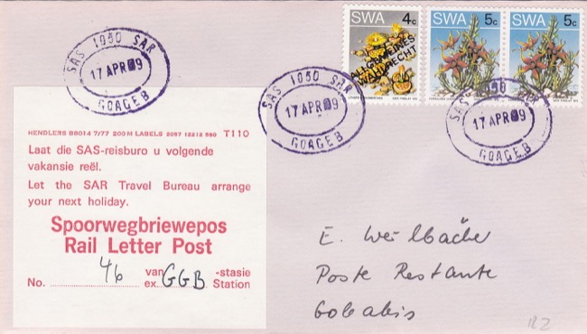 17.04.1979: Brief aus Goageb mit Stempel R. 1 nach Gobabis, befördert auf der Südlinie bis Keetmanshoop und dann auf der Nord - Südlinie nach Windhuk, von da nach Gobabis [1] | |