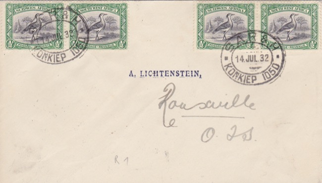 14.07.1932: Brief aus Konkiep mit Stempel R. 1 nach Rouxville SA. | |