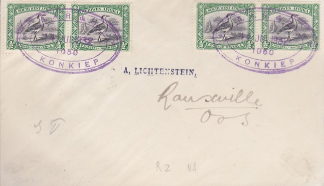 14.07.1932: Brief aus Konkiep mit Stempel R. 2 nach Rouxville SA, befördert auf der Südlinie bis Seeheim und weiter mit der Nord – Südbahn über Nakop [3] | |