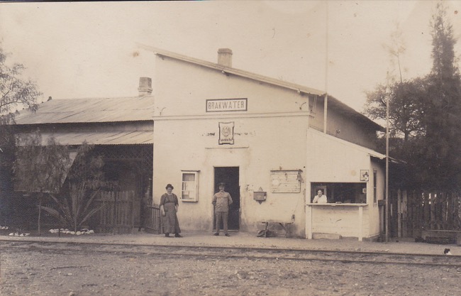 Fotokarte Brakwater mit dem Stationsvorsteher und dem Kiosk. Das Gebäude musste nach dem Aufstand 1904 wieder in Stand gesetzt werden, aber ohne Obergeschoss. Postschild und der Postkasten wurden 1909 angebracht. [1] | |