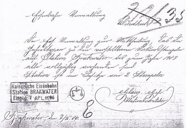 "Eisenbahn Verwaltung Windhuk / Der gef. Verwaltung zur Mittheilung, dass die Jahrestypen zu den verstellbaren Datumstempeln auf Station Brakwater bis zum Jahr 1909 alle vollzählig vorhanden sind. Station ist im Besitze von 2 Stempeln / Glawy Gefr. Stationsvorsteher" [3] | |