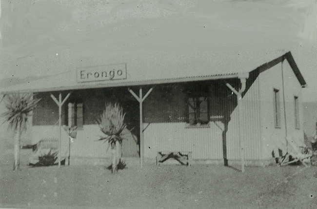 ERONGO ist die 12. Station der Otavibahn bei km 199 und liegt zwischen Usakos und Omaruru, sie wurde im Juni 1905 eröffnet. Eine Poststelle kam nicht in Betracht. Nach der Übernahme durch die S.A.R. & H. wurde Erongo die Nr. 1095/3 der Nordbahnlinie von Walvis Bay bis Tsumeb.