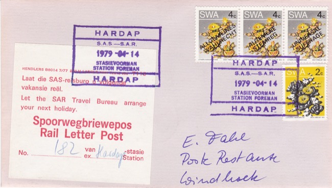 14.04.1979: Brief aus Hardap mit Stempel R. 1 nach Windhoek, befördert auf der Nord – Südlinie [1] | |
