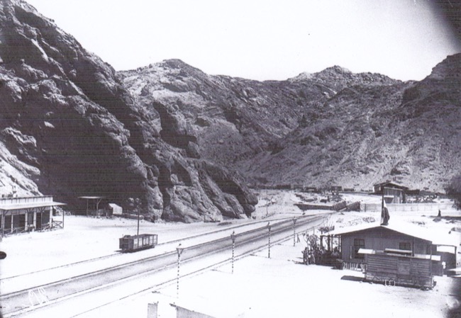 Blick von Osten zum Khanrivier mit Gleisanlagen und Bahngebäuden [1] | |