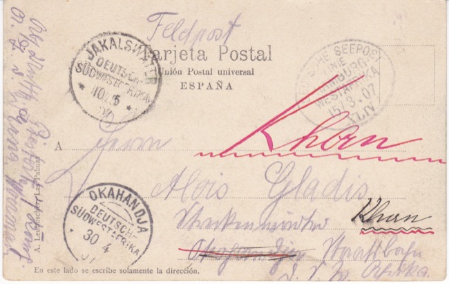 Portofreie Feldpostkarte von Bord des Woermann Dampfers „Erna Woermann“ vom 15.3.07 an den Streckenwärter Herrn Alois Gladis in Okahandja, dort am 30.4.07 und mit handschriftlichem Vermerk weitergeleitet nach Khan über Jakalswater mit Durchgangsstempel vom 10.5.07 [1] | |