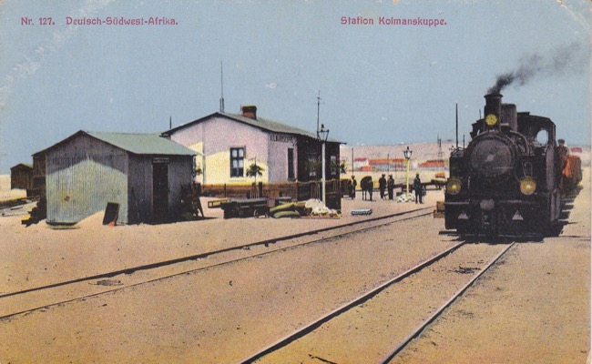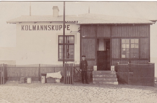 KOLMANNSKUPPE ist die 2. Bahnstation auf der Südbahnlinie bei km 16 von Lüderitzbucht und öffnete am 15. Mai 1906. Eine Posthilfsstelle wurde am 21. Februar 1909 geöffnet und am 18. September 1914 geschlossen. Das sich längs der Küste erstreckende Diamantensperrgebiet wurden mit verschiedenen privaten Werkbahnen in 600 mm Spurbreite erschlossen, die jeweils von Kolmannskuppe abzweigten.