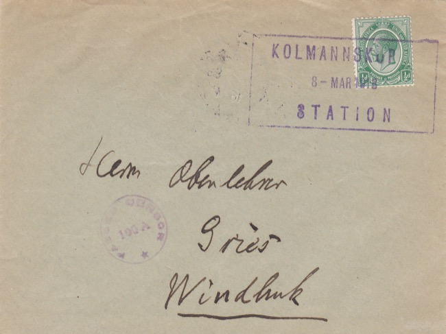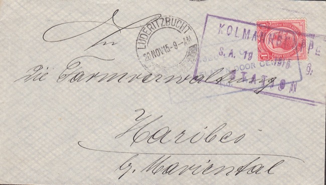 19.11.1915: Brief aus Kolmannskuppe mit Stempel R. 1 nach Karibib, befördert auf der Südlinie bis Seeheim und dann auf der Nord – Südlinie [3] |