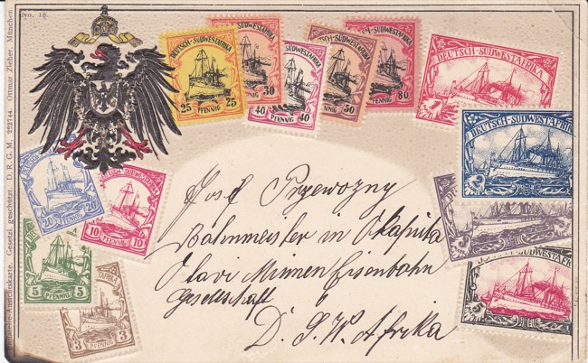 Ziererkarte mit Text: "Josef Przewozny, Bahnmeister in Okaputa, Otavi Minnen Eisenbahn Gesellschaft" [1] | |