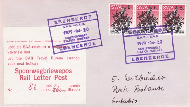 20.04.1979: Brief aus Ebeneerde mit Stempel R. 1, befördert auf der Nord - Südlinie bis Windhoek, von dort weiter nach Gobabis [3] | |