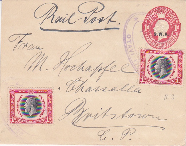 16.05.1935: Brief aus Otavi mit Stempel R. 2 nach Britstown SA, befördert auf der Nordlinie bis Kranzberg und dann auf der Nord – Südlinie über Nakop nach Südafrika [3] | |