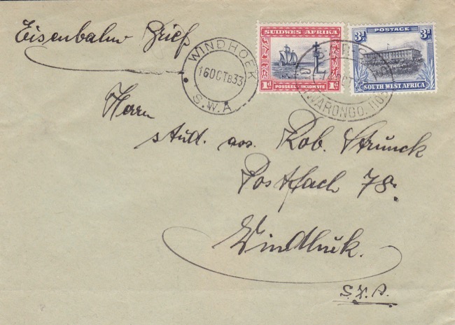 14.10.1933: Brief aus Otjiwarongo mit Stempel R. 3 nach Windhoek, befördert auf der Nordlinie bis Kranzberg und dann weiter auf der Nord - Südlinie nach Windhoek [3] | |