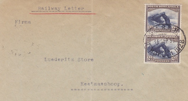 16.09.1933: Brief aus Rehoboth mit Stempel R. 1 nach Keetmanshoop, befördert auf der Nordlinie [1] | |