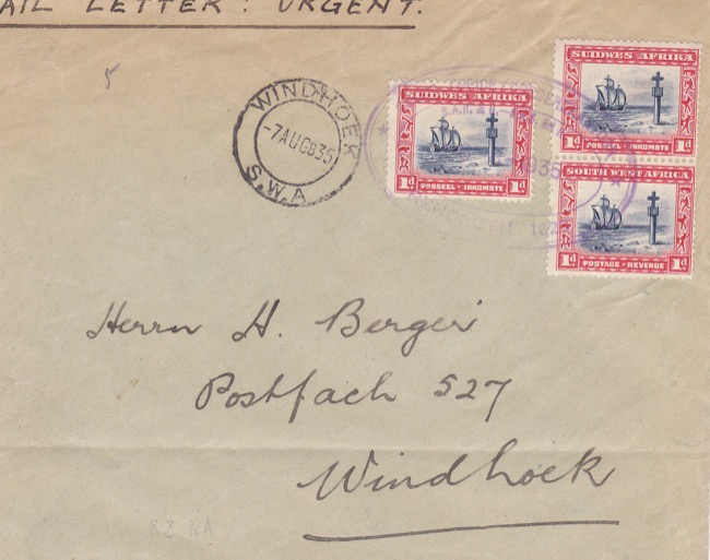 05.08.1935: Brief aus Rehoboth mit Stempel R. 1 nach Windhoek, befördert auf der Nordlinie [1] | |