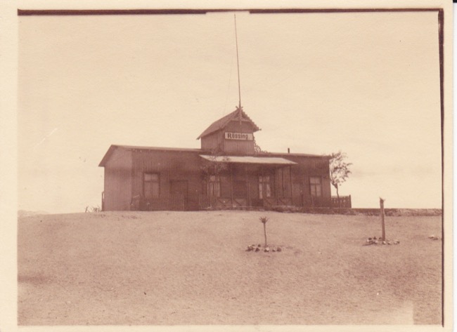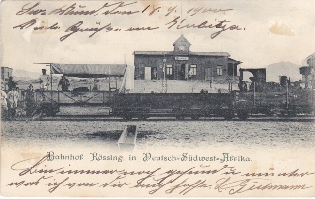 Ansichtskarte Bahnhof Rössing in Deutsch-Südwest-Afrika ca. 1900, denn das Gebäude zeigt eine Uhr am Giebel und den Anbau. [1] | |