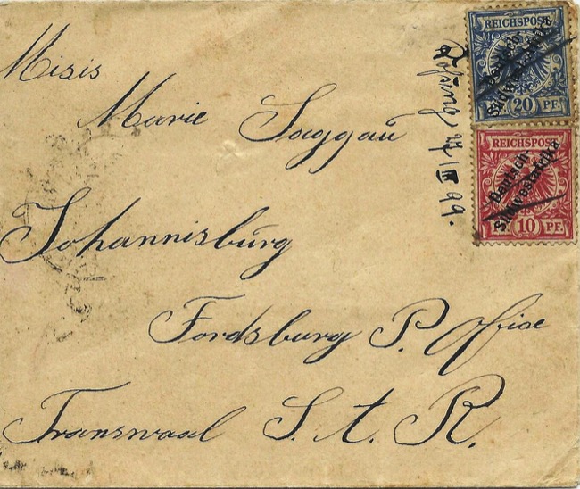 Bedarfsbrief aus Rössing mit handschriftlicher Bahnpostentwertung "Rössing 27/III 99." über Capstadt nach Fordsburg / Transvaal [3] | |