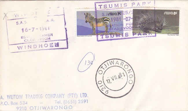 11.07.1981: Brief aus Tsumis Park mit Stempel R. 1 nach Otjiwrongo, befördert auf der Nord – Südlinie nach Kranzberg und dann weiter auf der Nordlinie [1] | |