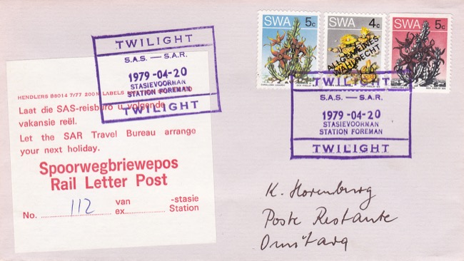 20.04.1979: Brief aus Twilight mit Stempel R. 1 nach Omitara, befördert auf der Nord – Südlinie bis Windhoek und dann weiter auf der Linie nach Gobabis [1] | |