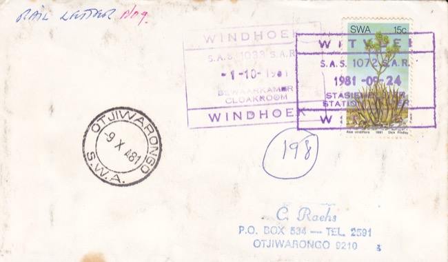24.09.1981: Brief aus Witvlei mit Stempel R. 2 nach Otjiwarongo, befördert bis Windhoek, dann auf der Nord - Südlinie bis Kranzberg und mit der Nordbahn nach Otjiwarongo [1] | |